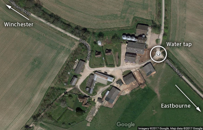 Heading from Winchester through the farm, you will find the tap against the hedge just on the right hand bend after passing through the barns.